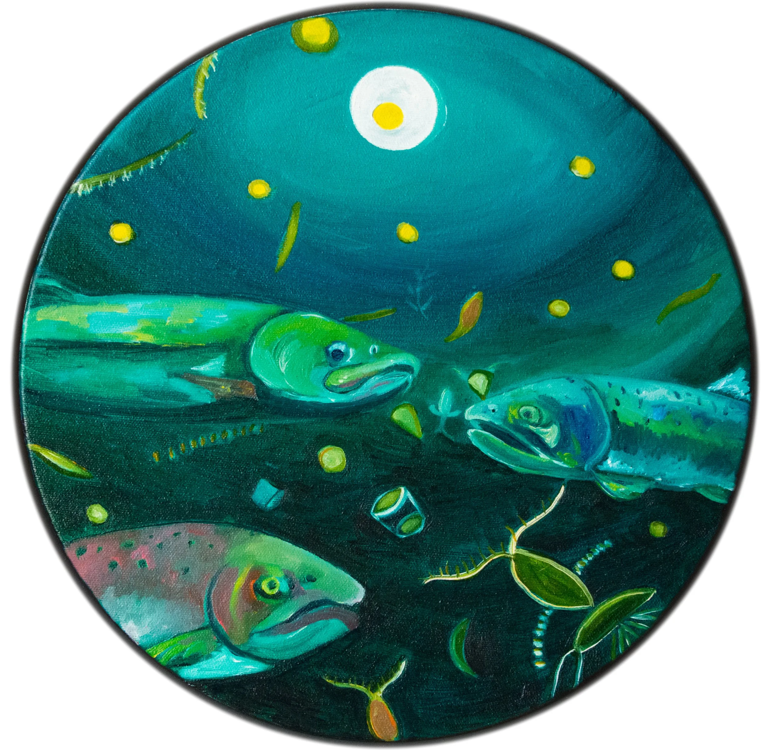 Amartut Iraluat or the ‘Pink Salmon Moon’. Series of 12 circular calendar paintings commissioned by Bristol Bay School. 2024.